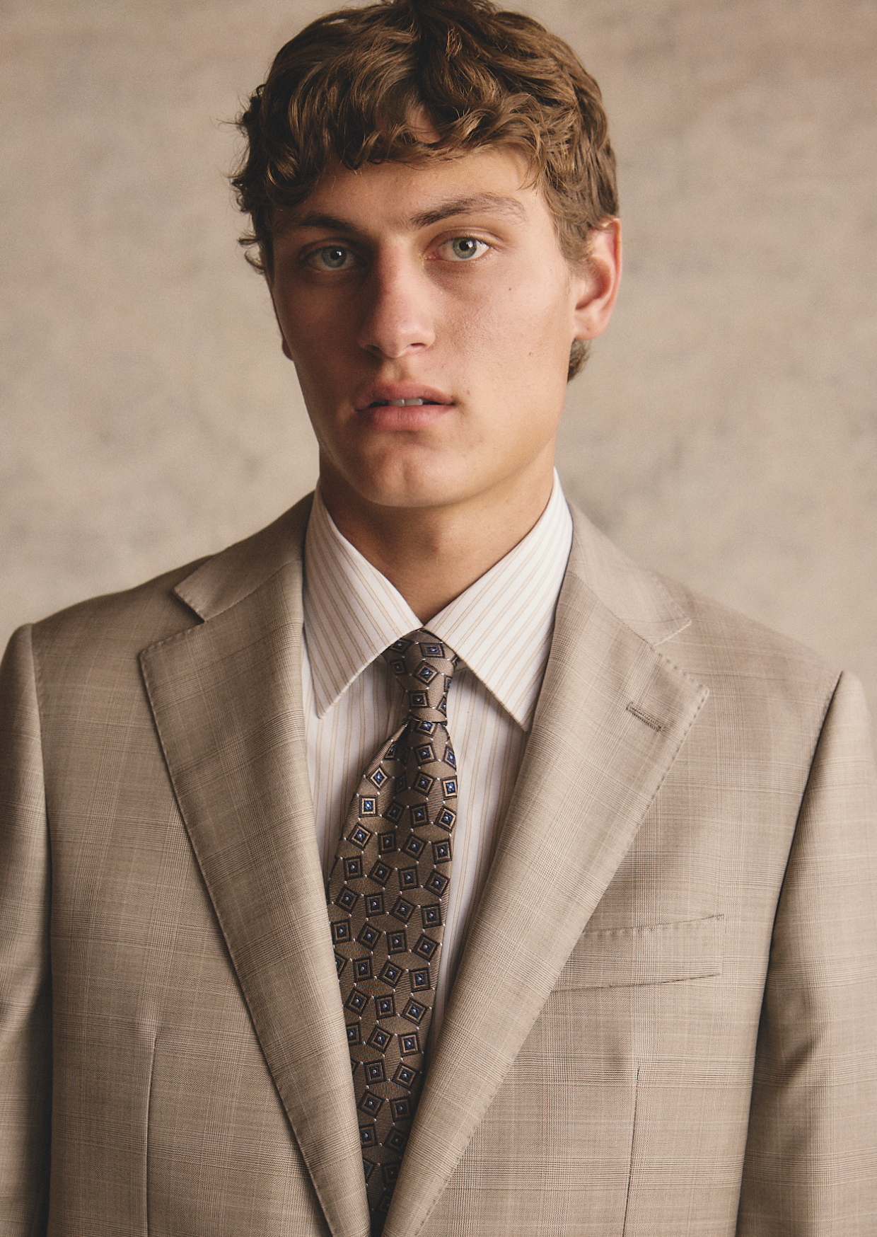 Oaks Day presents the perfect chance to embrace colour and individuality while keeping your look refined and timeless. The Mateo Suit in fawn is a refined slim-fit design crafted from luxurious 100% Super 110’s wool with a subtle Prince of Wales check. Its transeasonal versatility, soft shoulder pads, and sharp two-button closure create a polished, modern silhouette that transitions seamlessly from daytime festivities to evening celebrations.